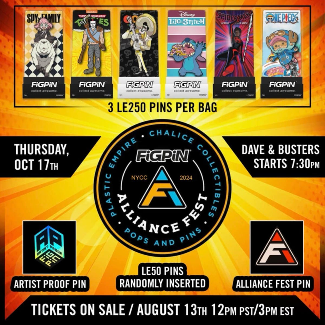Each ticket will gain access for (1) person to our exclusive venue Dave & Buster's Times Sqare NYC and will include free food and games from 7:30-10:30pm, and our event package will include (3) LE 250 FiGPiNs (w/ chance of six different LE 50 FiGPiNs Randomly Inserted), (1) Alliance Fest Shield FiGPiN and (1) Artist Proof FiGPiN! We will also have additonal raffles for prizes and many many more surpises! This is an all ages event, but each person will need their own ticket regardless of age. *Tickets to this event are non transferrable. We will check IDs at the door of the event to match the ID of the person to the ticket purchaser. If the names do not match we will not permit entry. The reselling of tickets is strictly prohibited and will result in loss of refund. Please reach out via email if you have any additional questions regarding this policy.*