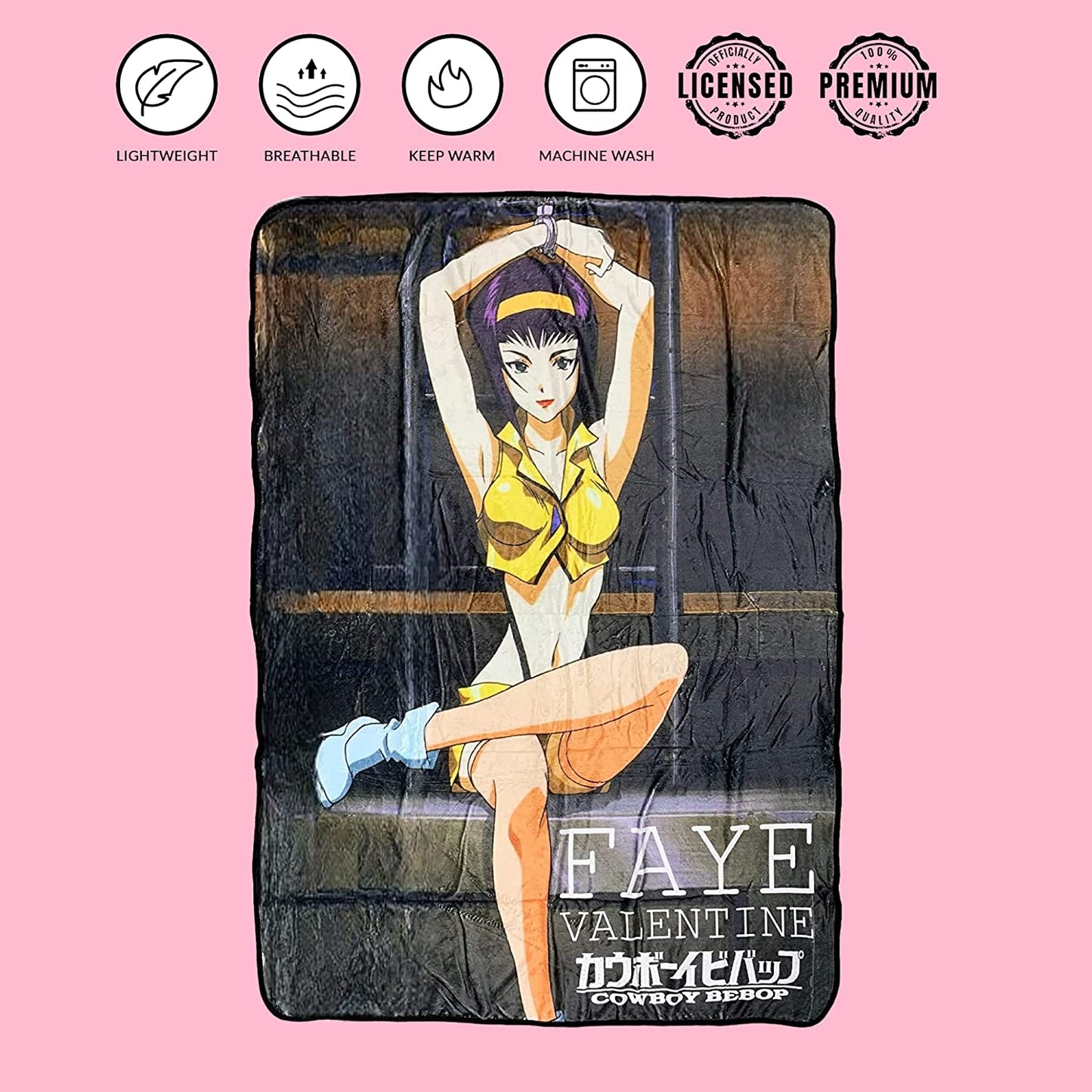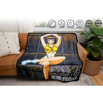 Who wouldn't want to wrap up in a super soft lightweight blanket of your favorite character? Snuggle up and get ready to watch your favorite show with this very soft blanket. Make that special person in your life squeal with joy when they find their favorite Cowboy Bebop character, Faye Valentine on a nice and soft blanket inside a gift bag you wrapped up for them. Feel good knowing you got an officially licensed blanket that supports the brand. Perfect addon to the Cowboy Bebop fanatic in your life. Complements any anime bedding, fleece, throws, and adds that pop of color to your couch, bed, or home office chair. Delicate wash and dry is highly recommended to keep your blanket in its best condition for years to come.