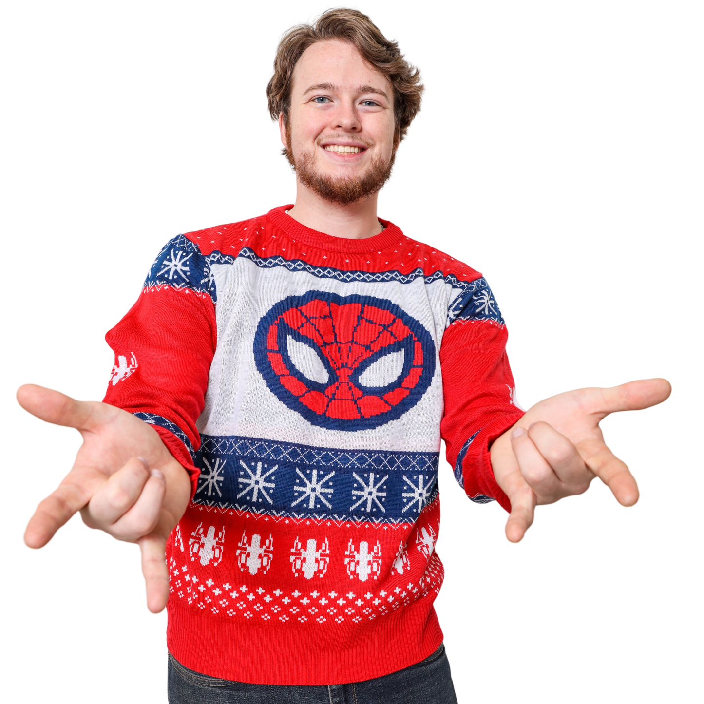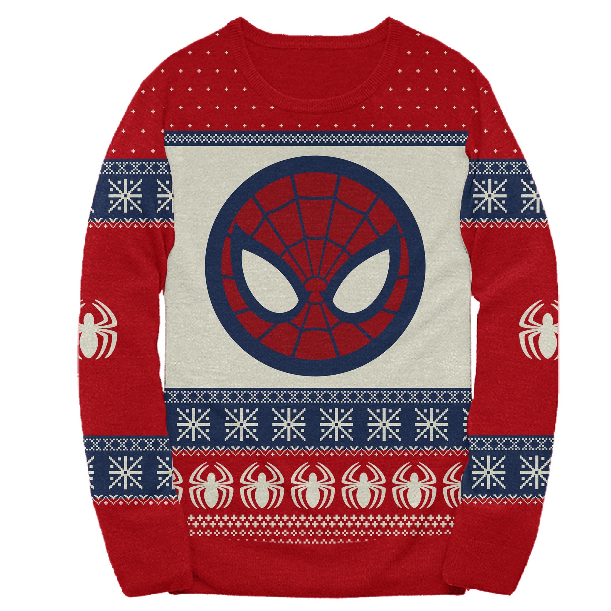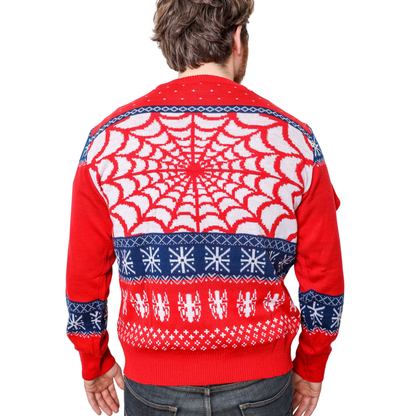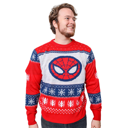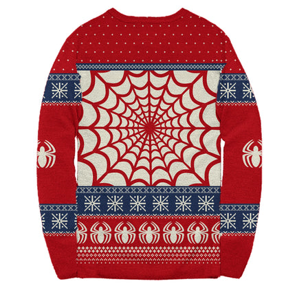 Marvel Ugly Christmas Sweater featuring Spider-man Symbol and face. Celebrate the holiday season with your favorite Marvel Superhero