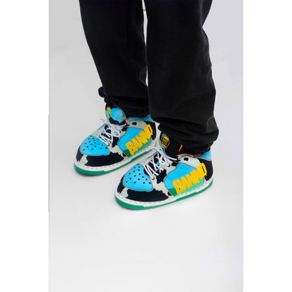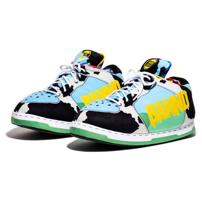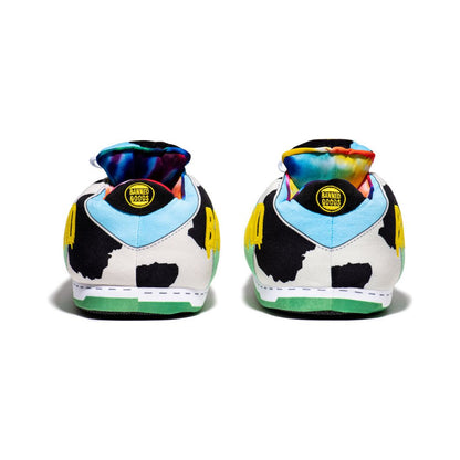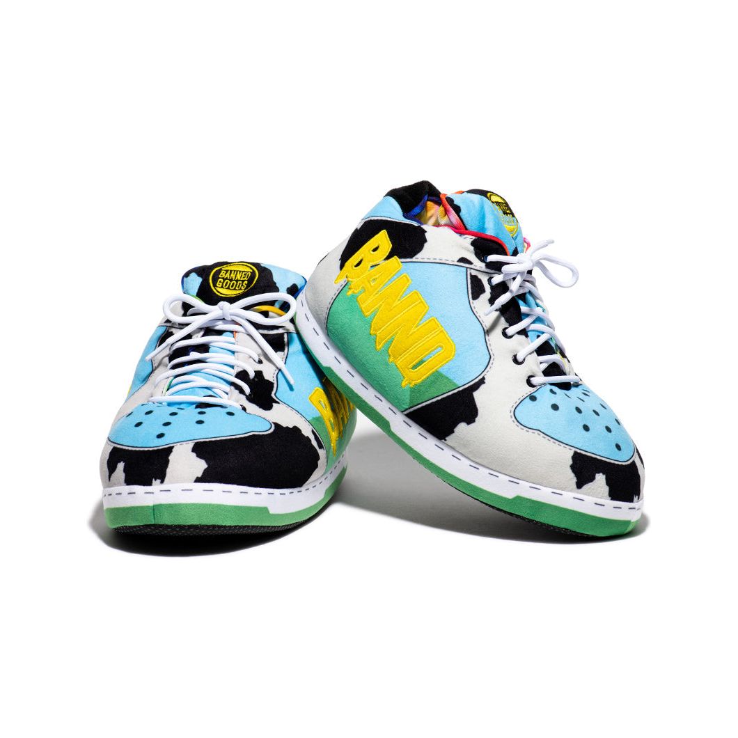 Make a statement in the Moo Low sneaker slippers from Banned Goods. With greens, blues and cow print, these lightweight, cozy house shoes are reminiscent of cows grazing in green pastures with blue skies.
