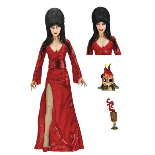 From NECA. The devilishly delightful Cassandra Peterson has played the part of Elvira for more than 40 years with grace, humor and more than a little camp. NECA is proud to present this positively patriotic figure of the Mistress of the Dark in a sparkling red dress for your horror collection. The 8" Elvira action figure is fully articulated and features tailored fabric clothing, plus plenty of accessories... alternate winking head, skull and snake candle holder, chalice, and figure stand.